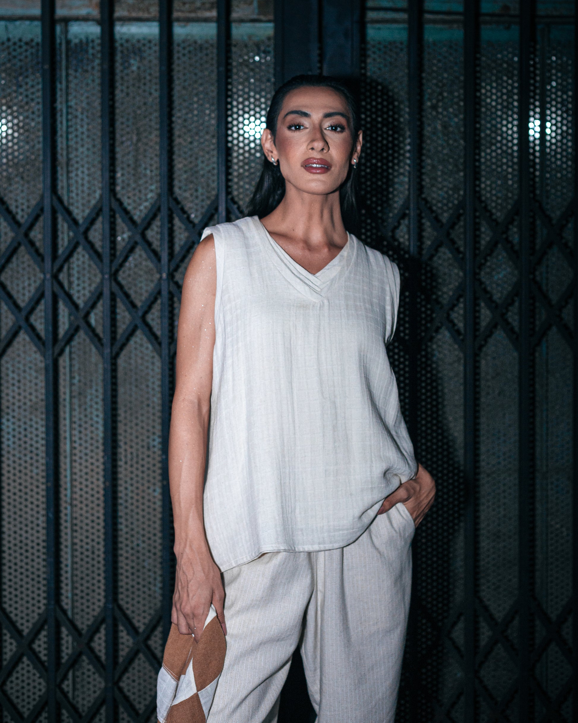 O Início — Regata de Gaze + Calça Off-White + Lenço de Retalhos