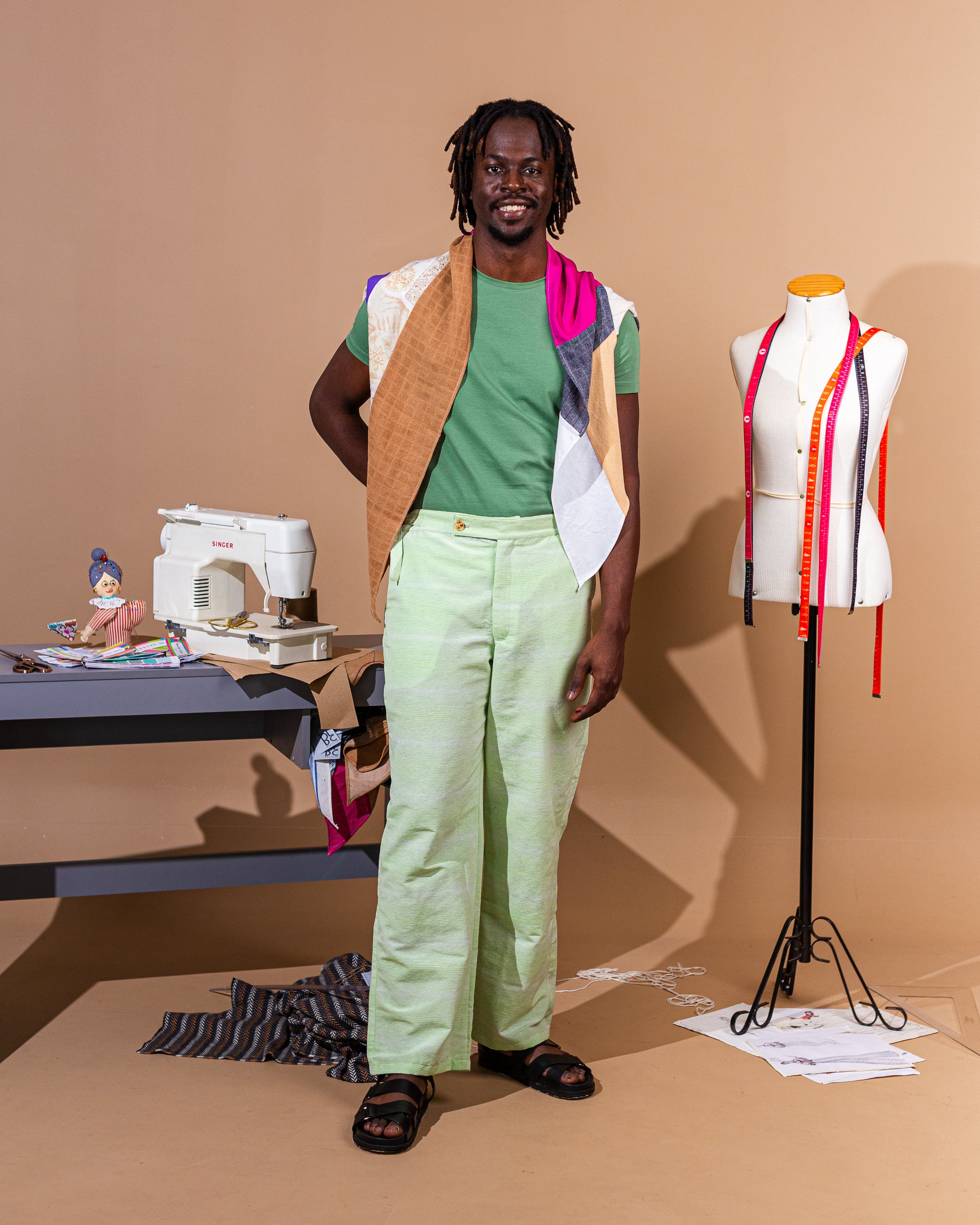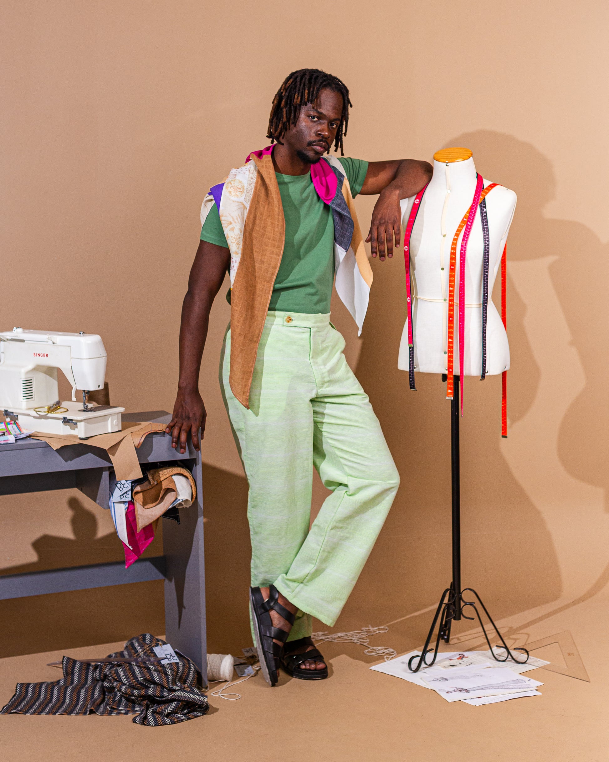 - “Modelo vestindo a calça verde ‘Ver o Mar’ em estúdio de ateliê, vista frontal, alfaiataria reta e leve.”