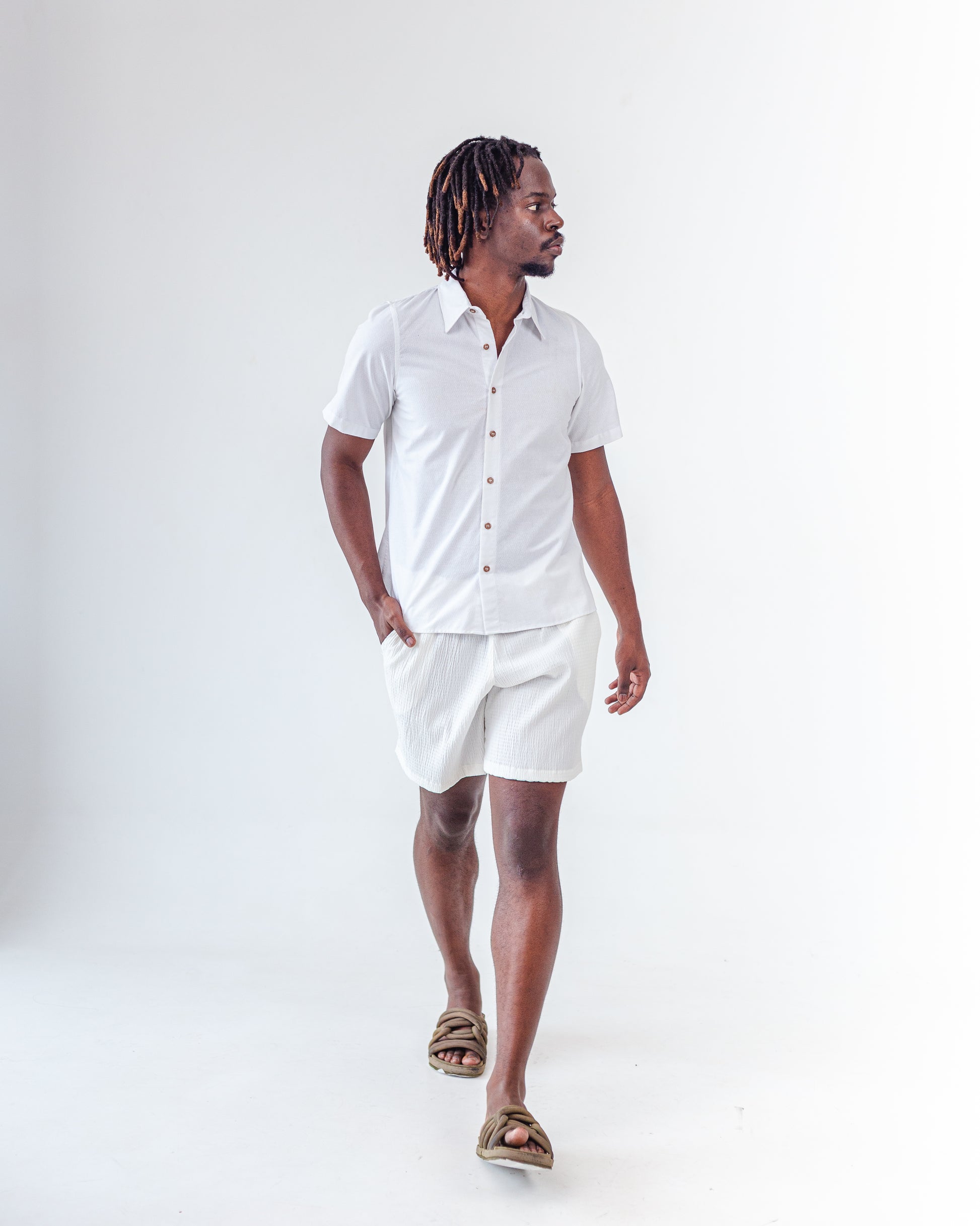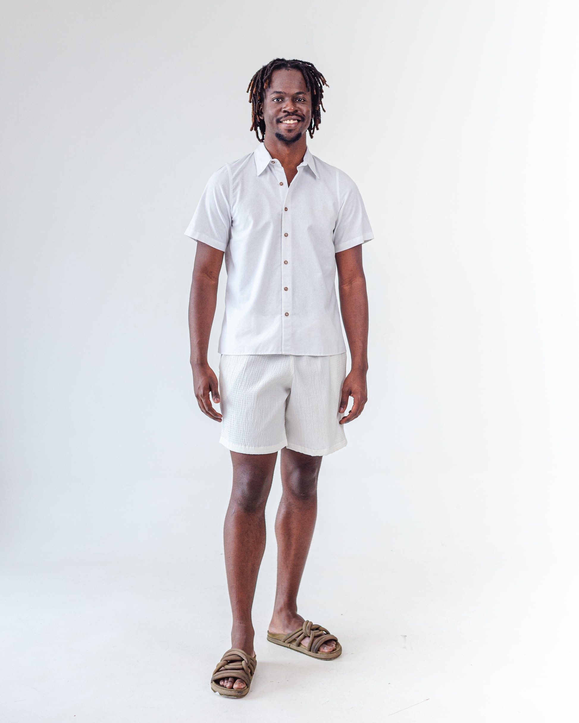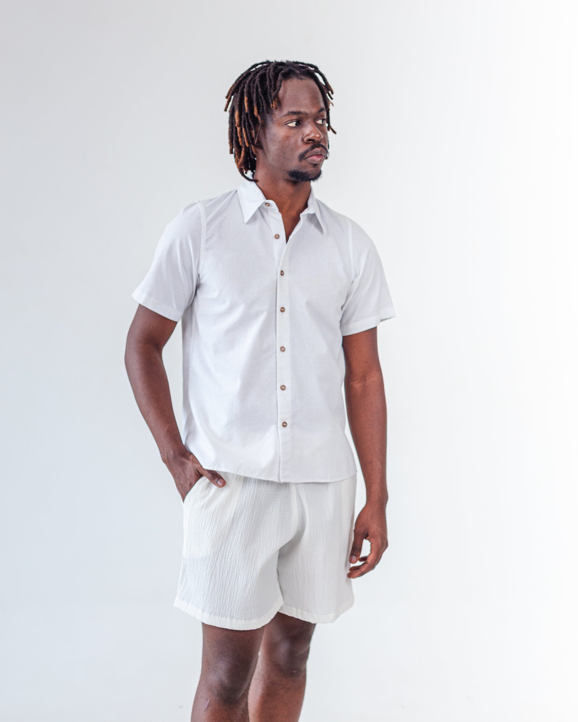 Camisa de modelagem ampla e corte unissex, com caimento leve e suave. Gola tradicional, mangas curtas e abotoamento frontal com botões de PET com borra de café. Tecido sustentável com base em algodão, obtida de reciclado de aparas de algodão e garrafas PET retiradas do meio ambiente. A superfície tem leve textura e movimento, lembrando as ondulações da água. Pode ser usada aberta como sobreposição ou fechada, como peça principal.