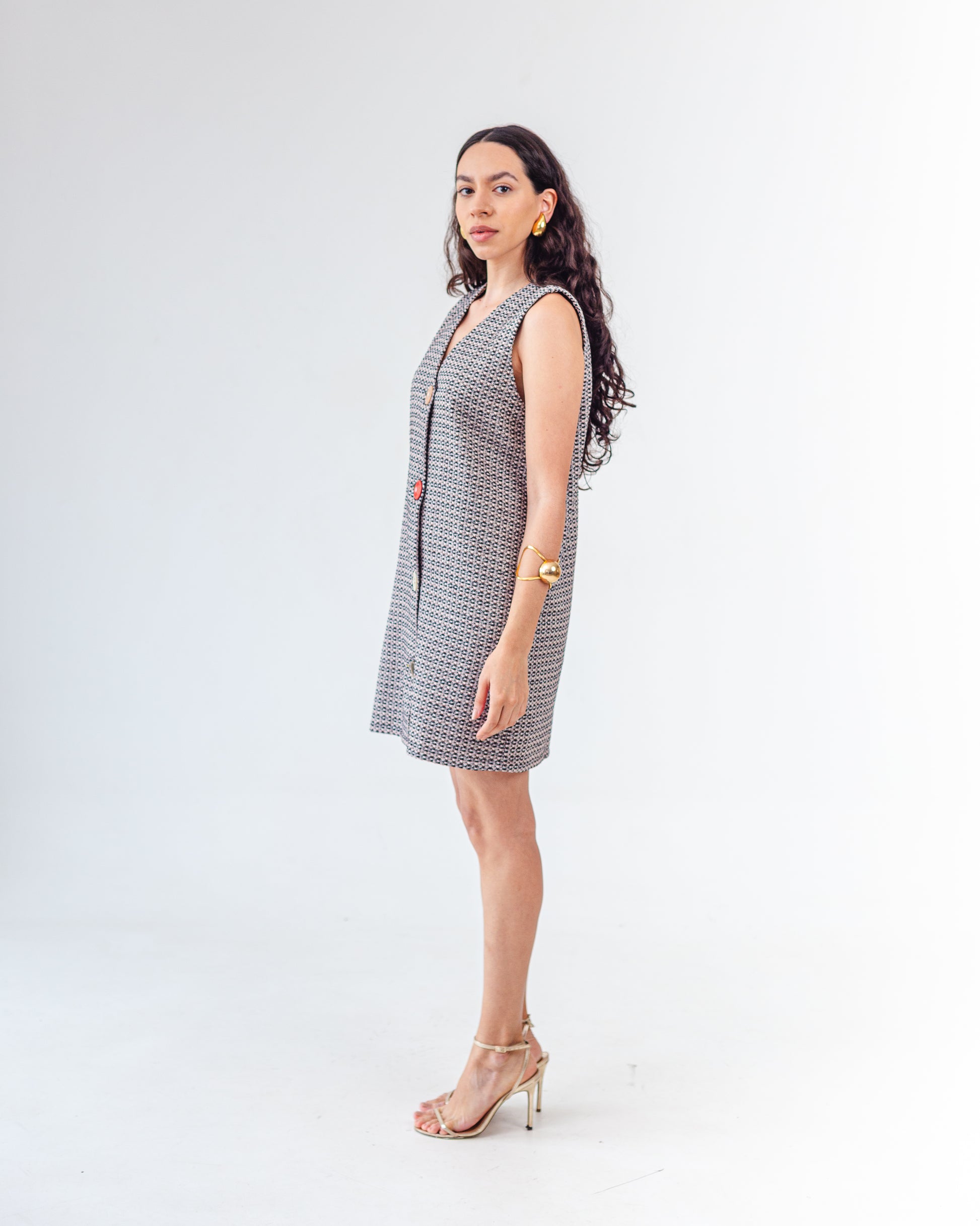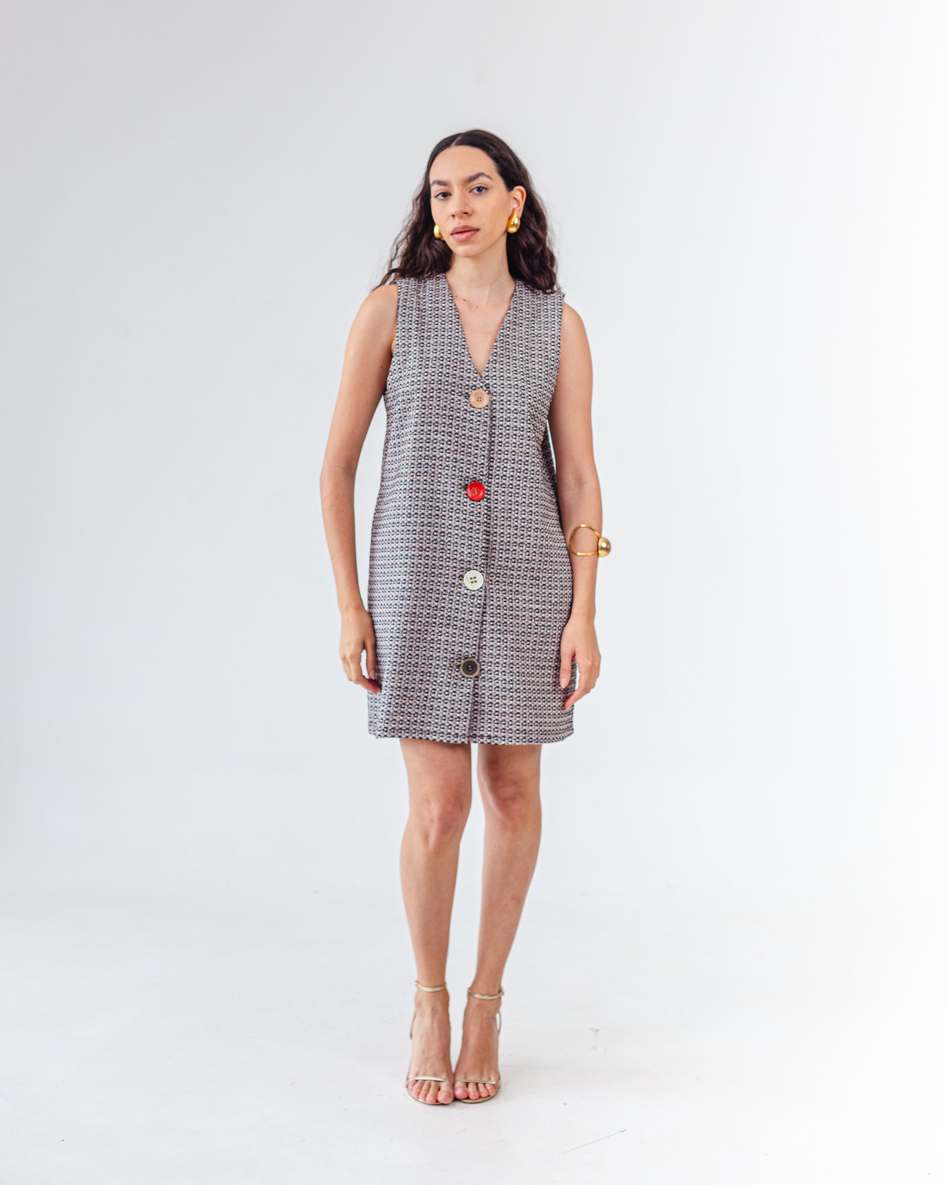 Imenso em presença, delicado em intenção. O Coletão “Abotoada” é uma escultura vestível que desafia tempo, gênero e padrão. Suas linhas amplas abrigam liberdade, enquanto os botões contam a história de uma antiga loja de aviamentos — onde, com o passar dos anos, muitos botões perderam seu par. Foi dali que garimpamos, um a um, os botões que hoje finalizam essa peça única.