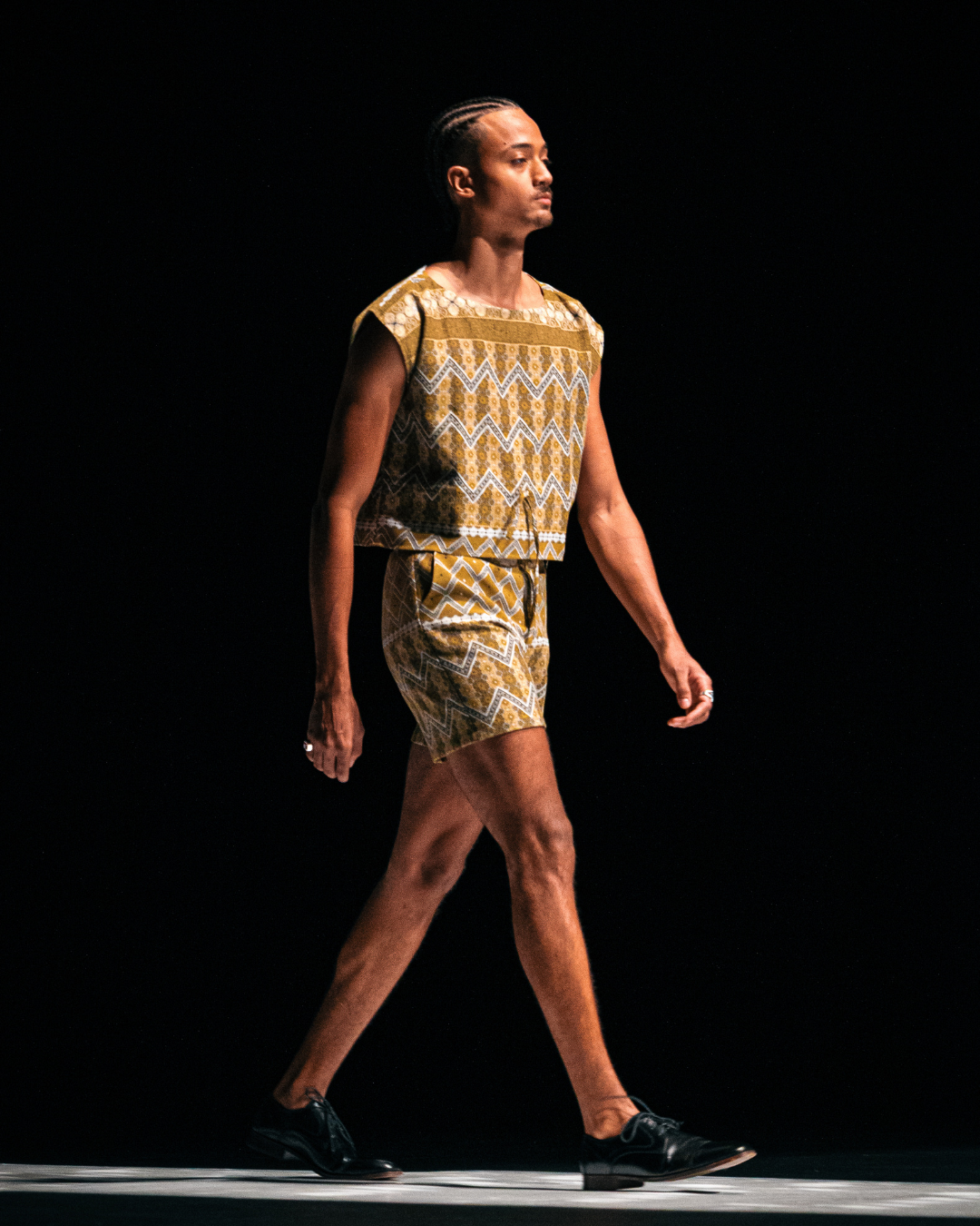 Conjunto com top regulável e short em estampa étnica tradicional, preservada e reinterpretada com consciência. O dourado — cor dos nobres, dos deuses e do Sol — ilumina o look e reforça sua estética ancestral. Tecido leve, durável e sustentável, trazendo história para o corpo de forma contemporânea.