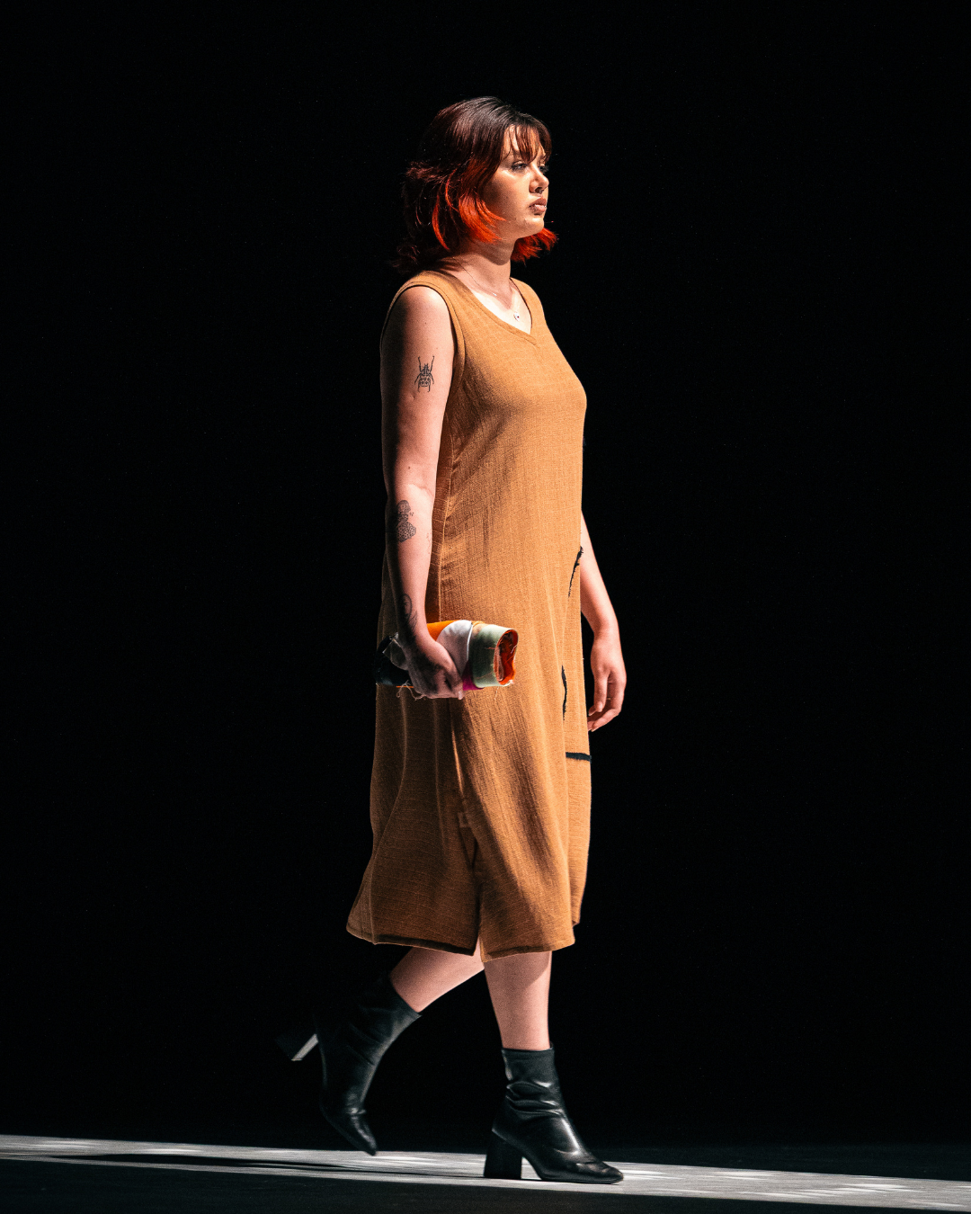 Vestido midi em trama rústica sustentável, leve e confortável. A peça simboliza a “linha invisível” que costura nossas histórias — uma metáfora do tempo, da organização interior e da criação. Modelagem ampla, sem excessos, feita em matéria-prima responsável. Um look que conecta propósito, simplicidade e identidade.