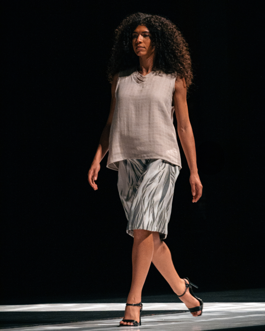 Uma releitura sustentável das roupas funcionais dos anos 40. A saia lápis é tecida em algodão de origem responsável e recebe a textura “magnetada”, que cria efeito de folhas em movimento. A regata de gaze sobreposta — leve, respirável e atemporal — traduz a estética prática da época com design autoral Belício. Ideal para quem busca moda sustentável com história, conforto e elegância minimalista.