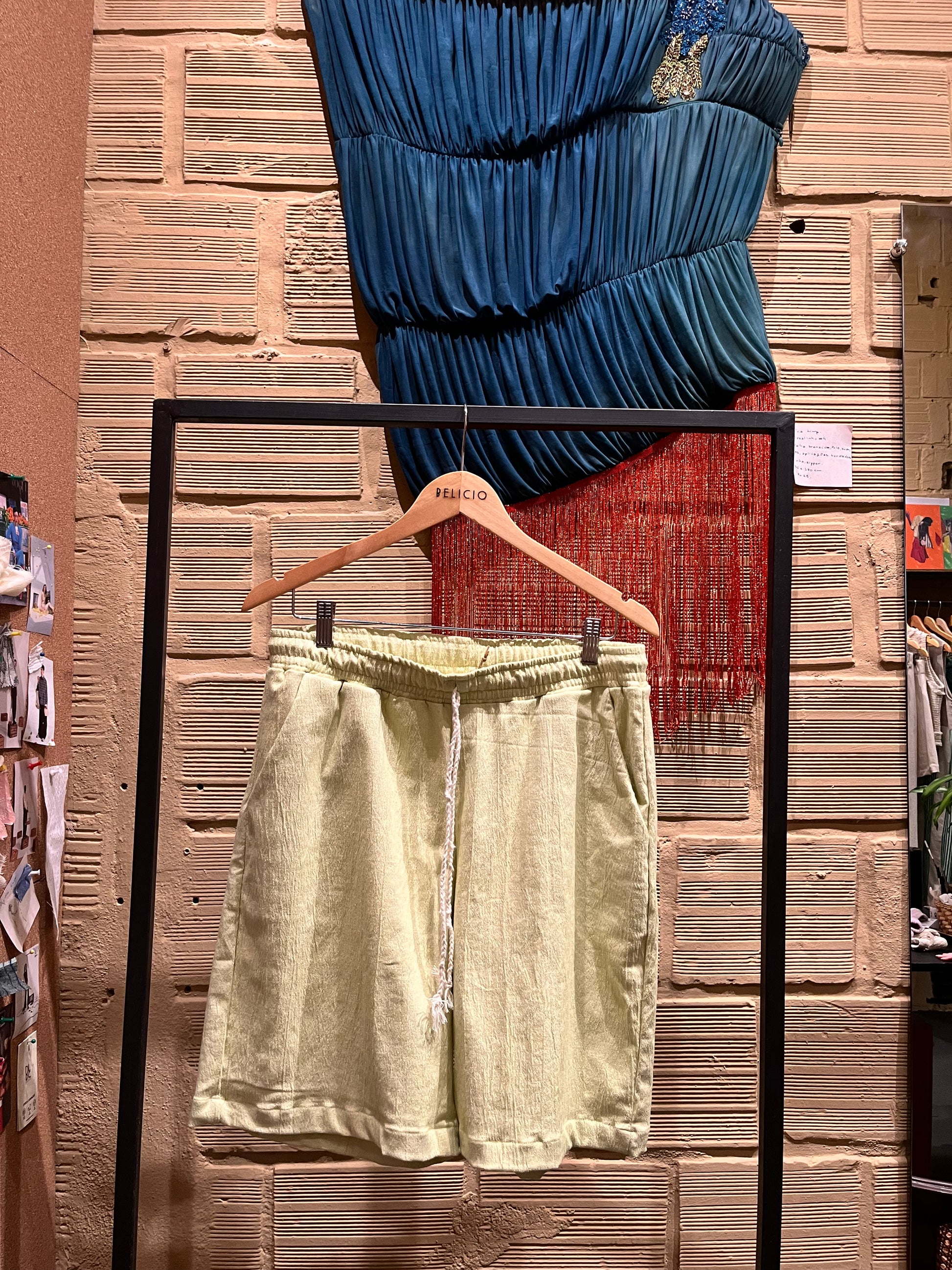 O Short “Ver o Mar” é confeccionado em tecido anarruga sustentável, leve e texturizado, com caimento confortável e toque natural. O tom amarelo-claro traz frescor e elegância descontraída, ideal para o verão.