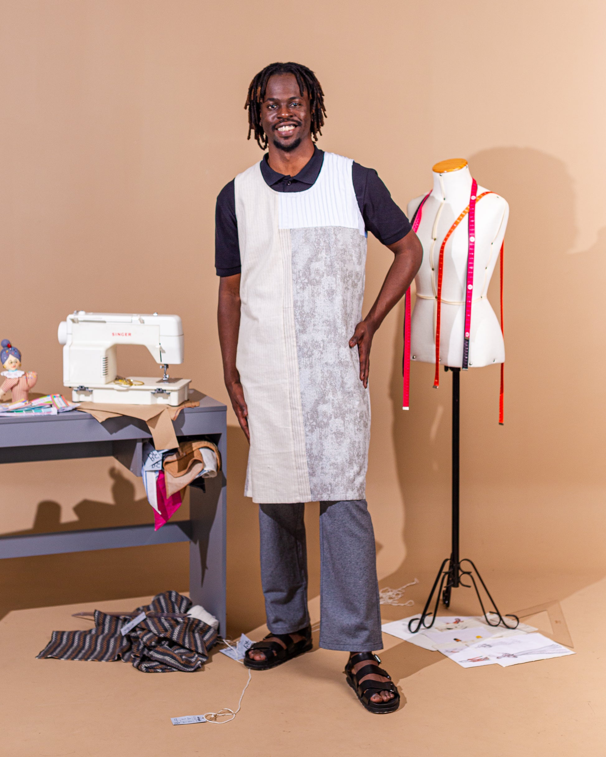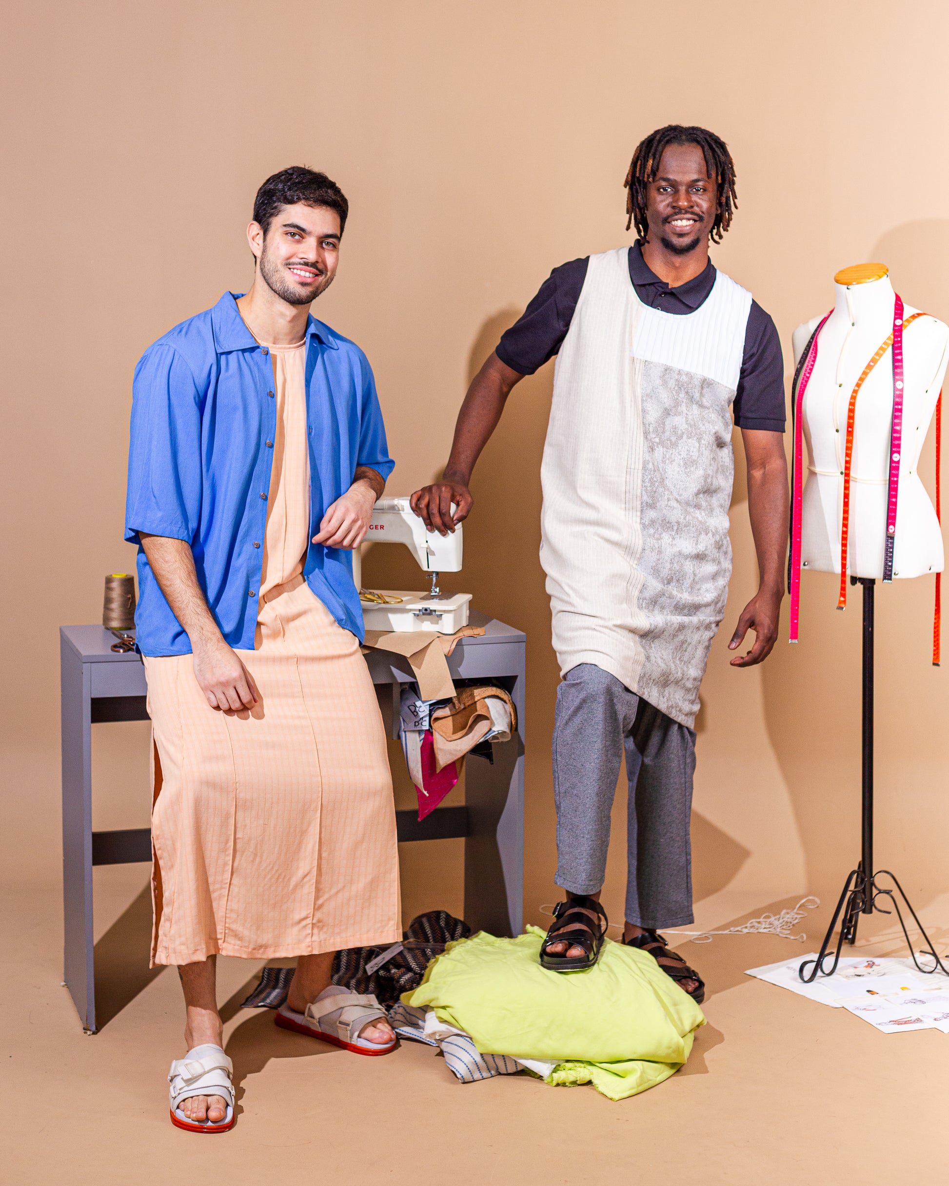 Não existe um igual ao outro: cada vestido é um mosaico afetivo, com cortes livres, combinações intuitivas e costuras cheias de intenção. Mais que roupa, é manifesto. Sobre memória, sobre reconstrução, sobre vestir o mundo com mais verdade.